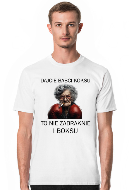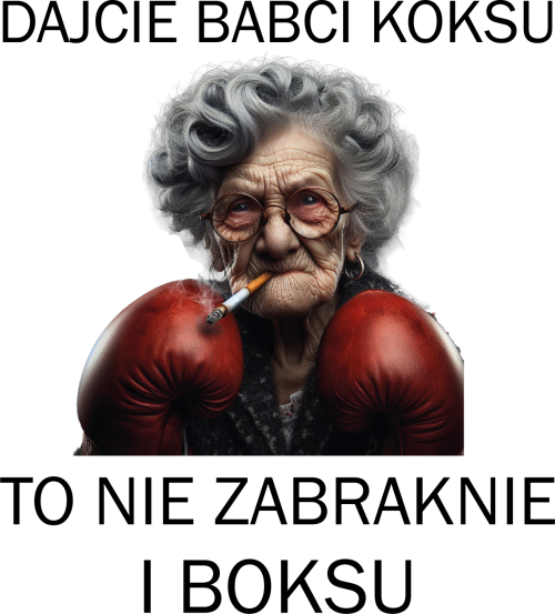 Babcia z papierosem w rękawicach bokserskich z napisem dajcie babci koksu to nie zabraknie i boksu.